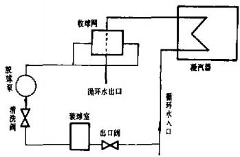 電廠凝汽器膠球清洗系統(tǒng)如圖1所示。密度與水相近的海綿膠球(用天然橡膠或合成樹脂制成)裝人球室后,啟動(dòng)膠球泵可以將膠球用比循環(huán)水壓力高的水流送入凝汽器水室。膠球直徑雖比銅管內(nèi)徑大1~2mm,但因是多孔柔軟的彈性體,很容易被水流帶入銅管,并被壓縮成卵形。膠球在行進(jìn)過程中抹去管壁上的污垢,流出管壁時(shí),依靠自身的彈力彈掉表面的污垢,并隨循環(huán)水流人收球室,然后被膠球泵重新送人凝汽器。