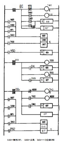 膠球清洗和反洗時(shí)間根據(jù)現(xiàn)場要求通常為幾十min甚至幾h,F?-60MR的定時(shí)器T大計(jì)時(shí)時(shí)間為999s,大約是16.5min。這樣滿足不了現(xiàn)場要求。本控制系統(tǒng)采用了計(jì)數(shù)器C與定時(shí)器T聯(lián)合計(jì)時(shí)的方法,計(jì)時(shí)范圍為999×999s,解決丁計(jì)時(shí)時(shí)間問題(見圖3)。另外,F(xiàn)?-60MR的定時(shí)器可以重復(fù)使用,只要正確送入K值即可。