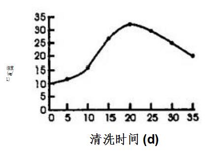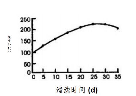 圖2、圖3顯示的水垢清洗過程中循環(huán)水濁度和硬度變化趨勢說明,加人GR-943后,濁度和硬度都開始增加,但增加趨勢略有差異。濁度在GR-943加入10d后快速增加,20d時達到大值32mg/L,25d后又開始快速下降。硬度在GR-943加入后呈線形增加趨勢,20d后增幅趨緩,26d時達到大值217mg/L,26d后呈緩慢下降趨勢,除垢過程趨于終點。