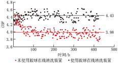 減小冷凝器污垢熱阻,可改善冷凝器換熱性能、降低冷凝溫度、減小壓縮機功耗和提高冷水機組的COP。根據現(xiàn)場測試結果,膠球在線清洗裝置使用前后COP的變化情況如圖3所示。