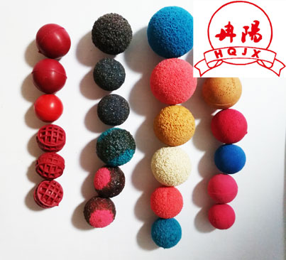 2、金剛砂膠球: 金剛砂膠球分為全金剛砂膠球和半金剛砂膠球兩種。金剛砂膠球適用于清除各種結垢沉積較多的管道,但對管子有傷害,一般不長期使用,特別銅管更慎用。有效去除硬質結垢,如:碳酸鈣。適用于鋼管、不銹鋼管換熱器。