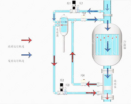 整個循環(huán)編程五分鐘,每小時清洗兩次。也可以根據(jù)具體情況進行改變清洗次數(shù)。通過冷卻水自身流量,小球發(fā)到冷凝管進行清洗,通過壓差球回到發(fā)射器。當球回到發(fā)射器時,累積在球上的污垢將會在發(fā)射器中進行反沖洗,發(fā)射器上端需要有透明視窗可以觀看到發(fā)球和收球狀態(tài),保持每天至少40次循環(huán)。從而保證每臺冷凝管在200小時內(nèi)都能被清洗到。