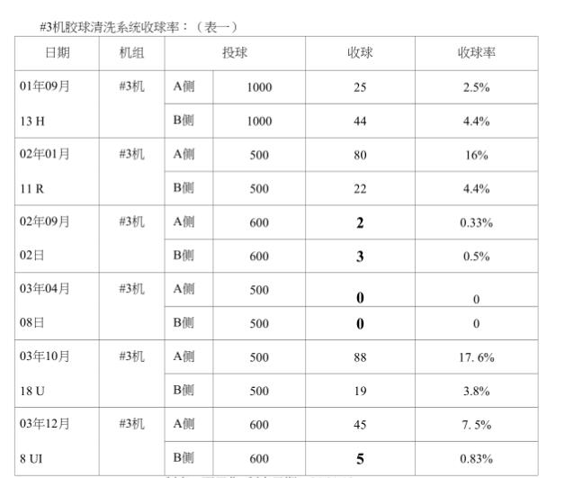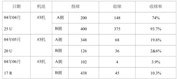 1#3機(jī)膠球清洗裝置系統(tǒng)收球率情況調(diào)查:我們小組把我廠2001一2003年度#3機(jī)膠球清洗裝置系統(tǒng)投、收球情況全部進(jìn)行了核查,發(fā)現(xiàn)收球率實(shí)在太低,有時(shí)加人幾百個(gè)球其至連-個(gè)球都收不到,現(xiàn)摘錄其中兒次投、收球數(shù)據(jù),以供大家了解我廠“收球率。