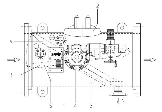 1收球器殼體;6收球網(wǎng)觀察孔;7驅(qū)動機(jī)構(gòu);3導(dǎo)流板N出球管管口;4軸承+/-壓差測量系統(tǒng)接口;5網(wǎng)板半橢圓形收球網(wǎng);5將膠球引至出球管管口N。