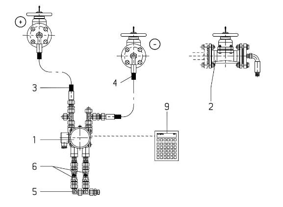 沖洗閥6測量時將壓差測量表與沖洗水分離。打開相應(yīng)沖洗閥,可用外部水源將壓差測量表以及柔性管內(nèi)的雜質(zhì)沖洗干凈。